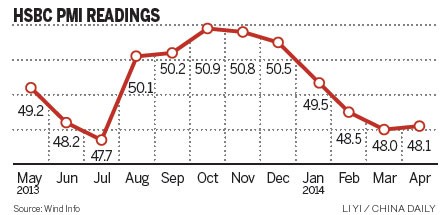 The final reading of the HSBC Holdings Plc and Markit Economics Purchasing Managers Index for April came in at 48.1, below the preliminary reading of 48.3 but up slightly from an eight-month low of 48.0 in March. It was the fourth month that the sector contracted.