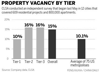 "The result is actually lower than what we had thought, because our experience told us the ratio could be roughly 25 percent," said Nicole Wong, regional head of property research of CLSA. She said vacancy rates in first-tier cities aren't that high, and higher ratios in some second-tier cities aren't a problem either.