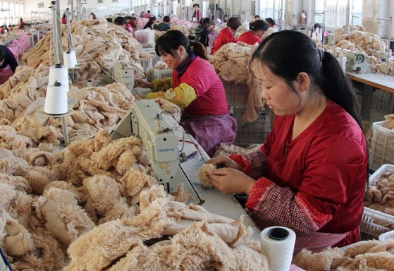 Workers produce stuffed toys at a factory in Ganyu county in Jiangsu province. Si Wei / For China Daily