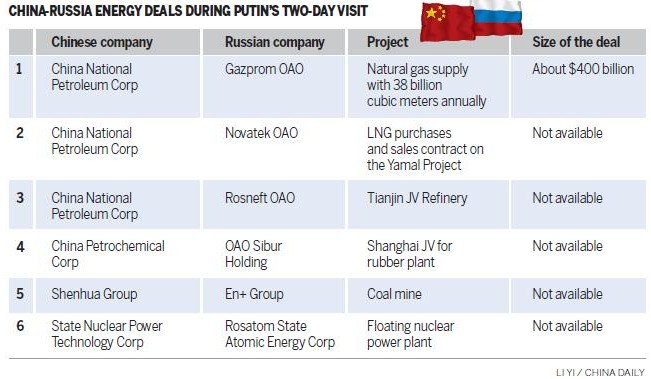 On Wednesday, State-owned China National Petroleum Corp and Russian's top gas exporter Gazprom OAO signed a 30-year natural gas supply contract valued at $400 billion. The deal has been in the works for about two decades.