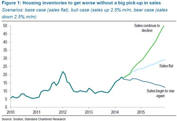 Others advocate and/or expect a RRR cut in Q2 or early Q3; we fall into this camp. We have a negative short-term view on growth. Credit growth is slowing and housing is heading into what could be a messy correction. Figure 1 shows what is likely to happen to housing inventories in China's top 40 cities if sales remain at today's levels. The situation in smaller cities could be worse – we have little data on this.