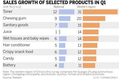 Nielsen's research showed that fast-moving consumer goods sales in China grew 8 percent in the first quarter, 2 percentage points faster than in the same period last year.