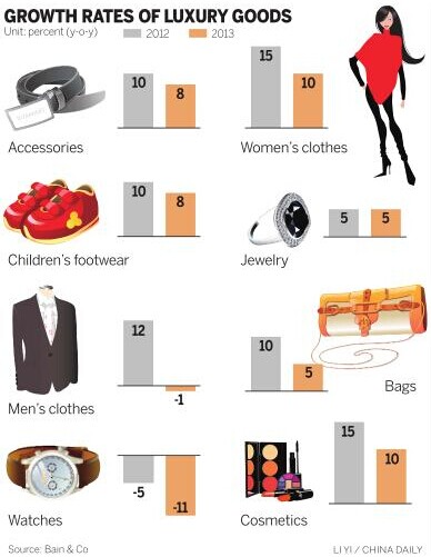 Consultant Bain & Co said luxury spending grew by only 2 percent in 2013, compared with a rate of 7 percent in 2012. Reasons include an increasing number of shoppers buying abroad and President Xi Jinping's mandate to officials to cut down on lavish spending and stepped-up probes into graft.