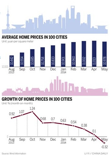 The average price in 100 cities sampled was 10,978 yuan ($1,770) per square meter in May, a dip of 0.32 percent month-on-month, according to the China Index Academy Ltd, a Beijing-based research institute that's wholly owned by SouFun Holdings Ltd.