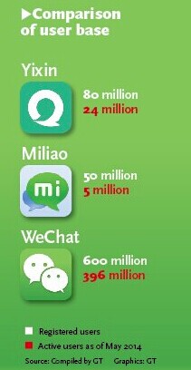 By contrast, Yixin, which is co-developed by the country's third-largest telecom carrier by subscribers China Telecom and Internet company NetEase, has 80 million registered users as of Saturday, while Miliao said on its Weibo Friday that its registered users has reached 50 million.