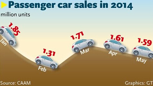 On a monthly basis, passenger car sales dropped 1.16 percent in May to a total of 1.59 million units, the second monthly drop in a row. Sales dropped 5.91 percent in April, CAAM data indicated.