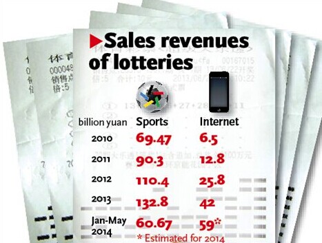 Domestic sales of sports lotteries hit 132.8 billion yuan in 2013, an increase of 20.2 percent year-on-year, and sales in the first five months ending May 2014 stood at 60.67 billion yuan, data from the Ministry of Finance showed.