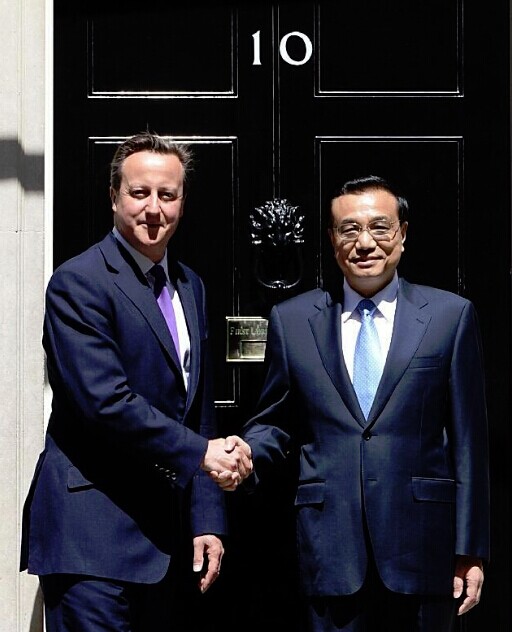 Chinese Premier Li Keqiang (R) shakes hands with British Prime Minister David Cameron during their annual meeting in London, Britain, June 17, 2014. (Xinhua/Li Tao)