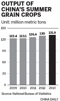 With a total cultivated area of 27.59 million hectares, the output of China's summer grain crops totaled 131.89 million metric tons in 2013, up 1.5 percent on a year-on-year basis.