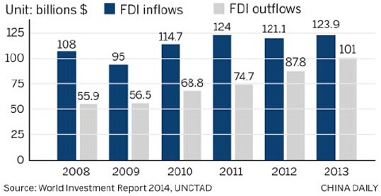 In 2013, investment outflows from China increased by 15 percent year-on-year to $101 billion, the third highest in the world after the United States and Japan, the report said.