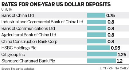Bank of China on Thursday was offering 0.75 percent on one-year dollar deposits. The rate set by Bank of Communications Ltd was 0.8 percent, compared with 0.95 percent at HSBC Holdings Plc and 1.25 percent at Citigroup Inc.