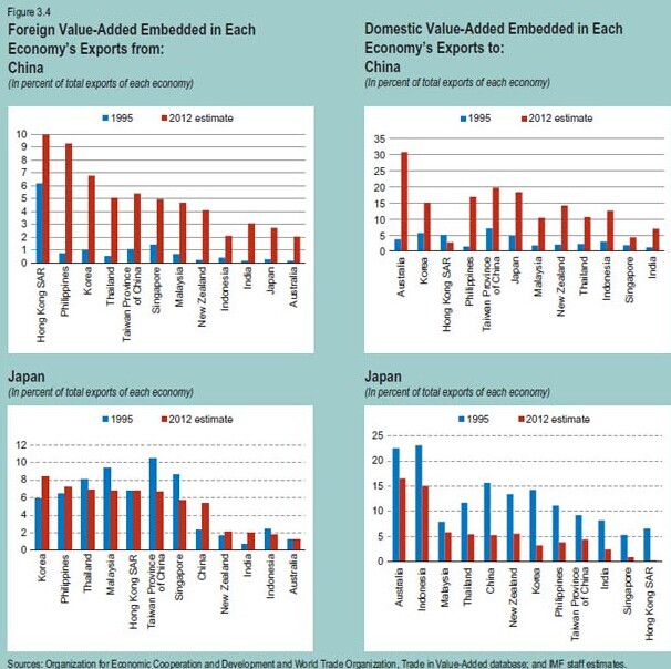 All 11 export-led economies in the region, except for Indonesia, have shifted their focus to China, with value added volume far outstripping that to/from Japan, according to the International Monetary Fund that compared data from 1995 to 2012 in a report - Regional Economic Outlook: Asia and Pacific - released on April 14.