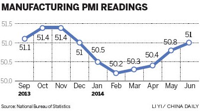 The official Purchasing Managers Index for June, jointly issued by the National Bureau of Statistics and the China Federation of Logistics and Purchasing, stood at 51, the fourth consecutive month the gauge has risen.