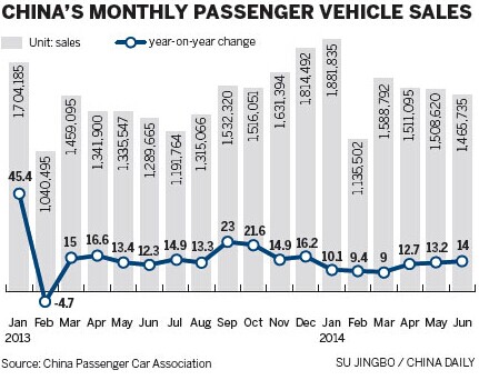Its sales in China during the first six months of this year rose by 10.5 percent from the same period in 2013 to 1,731,282 units. GM's China sales in June rose 9.1 percent to 257,798 units.