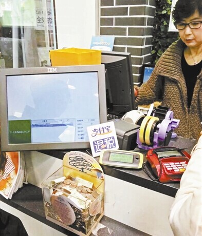 An Alipay tax-refund sign is seen on the counter. [File photo]