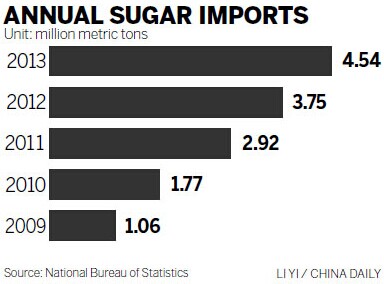 Customs statistics show that China imported 4.54 million metric tons of sugar in 2013, 21 percent more than a year earlier.