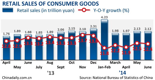 Retail sales grew 12.1 percent year on year to 12.42 trillion yuan ($2.02 trillion) in the January-June period, quickening from the 12 percent growth registered for the first quarter, the NBS said. The actual growth rate was 10.8 percent with inflation deducted.