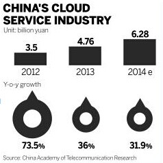 The total value of the public cloud market in China during 2014 is estimated at 6.28 billion yuan ($1 billion), a 31.9 percent increase over the corresponding period last year, according to the academy's estimates.