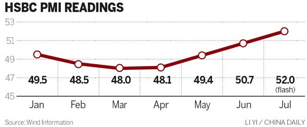 The preliminary reading of the Purchasing Managers Index, jointly released by HSBC Holdings Plc and Markit Ltd on Thursday, rose to 52 from the final June reading of 50.7, beating a market consensus of 51.