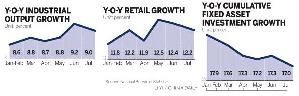 Li Huiyong, chief economist with Shenyin & Wanguo Securities, said although the industrial output growth has slowed by 0.2 percentage point from June to 9 percent, the increase was still higher than the 8.9 percent average rise in the April-June period, and was the second highest point this year.