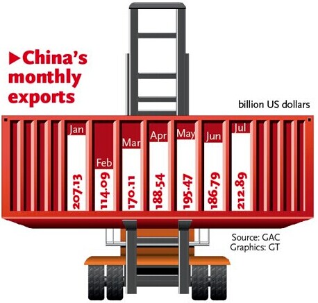 China reported encouraging trade data in July, helped by the government's stimulating policies as well as a recovery in external demand. Total trade volume in the month rose 6.9 percent year-on-year to around $378.48 billion. Exports surged 14.5 percent to $212.89 billion, compared with 7.2 percent growth in June, according to the GAC.