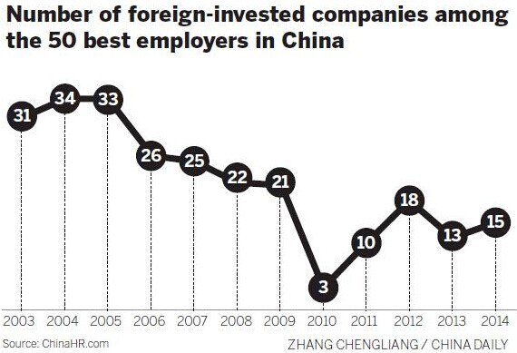 The report from Horizon showed that foreign-invested companies accounted for 24 percent of the top 50 best employers in 2014, down from 38 percent last year.