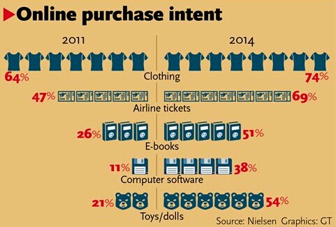 In a new study by global information and measurement company Nielsen based on an online poll of more than 30,000 respondents in 60 countries and regions, China had the highest percentage of respondents ready to shop online in 18 out of the 22 product categories tracked, Nielsen said in a survey release sent to the Global Times on Wednesday.