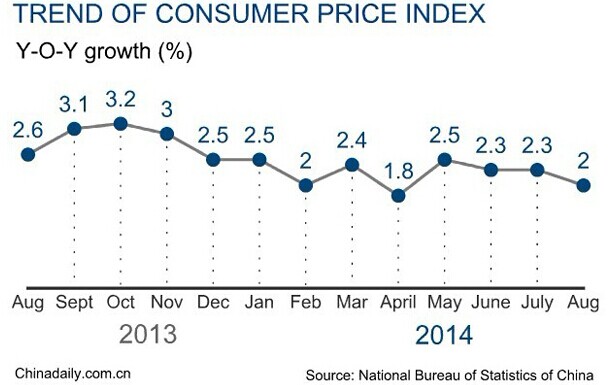 China's consumer price index, a main gauge of inflation, grew 2 percent year on year in August, the National Bureau of Statistics said Thursday.