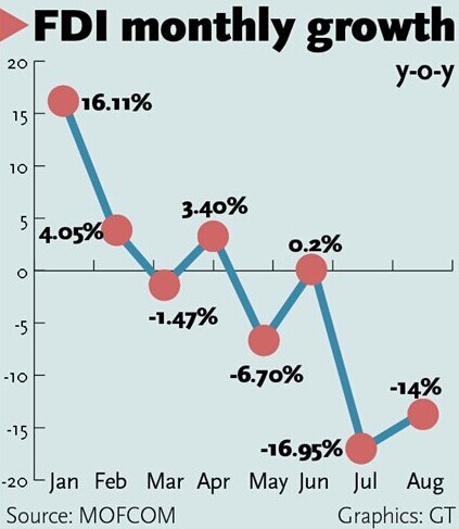 Figures released by MOFCOM Tuesday show that foreign direct investment (FDI) into non-financial sectors in August was $7.2 billion, down 14 percent over the same period last year.