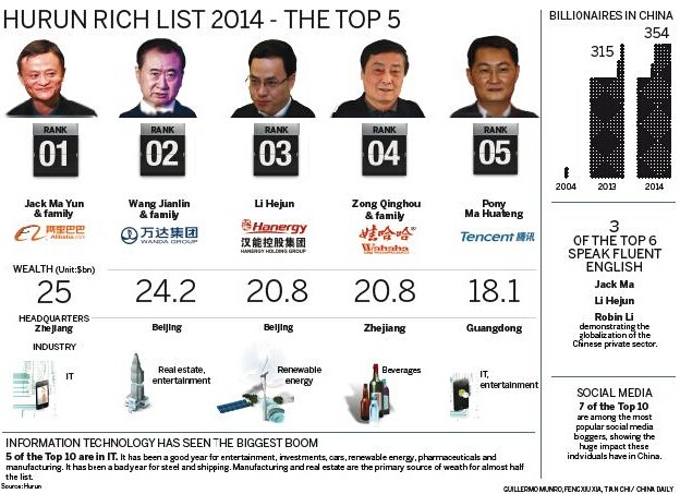 The rise of Chinese IT billionaires is also in line with the global trend. In the 2014 Hurun Global Rich List unveiled at the beginning of this year, 257 people from the IT industry made it onto the list, 57 more than that a year earlier and accounting for 13.7 percent of the more than 1,000 individuals listed.