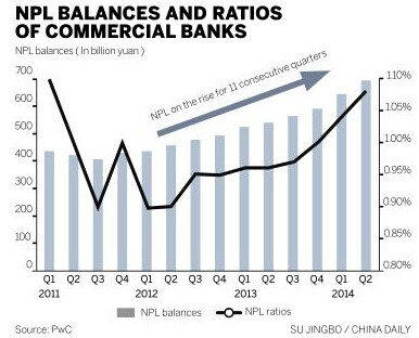 NPLs at the country's top 10 listed banks stood at 520 billion yuan ($84 billion) as of June 30, up 71 billion yuan from Dec 31, 2013. That was almost as much as the rise for all of last year, which was 73 billion yuan, according to PwC.