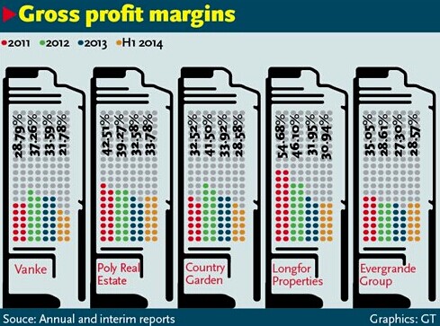 The average net profit margin of 202 listed Chinese property developers was 14.17 percent in the first half of 2014, according to data compiled by real estate consultancy rem.com.cn.