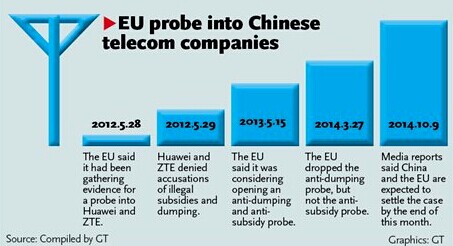 The EU announced on May 15, 2013 that it was considering opening an anti-dumping and anti-subsidy probe into Chinese telecom equipment firms, primarily Huawei Technologies Co and ZTE Corp. But it did not officially launch the probe, in order to "allow for negotiations toward an amicable solution," according to an EU press release in May 2013.
