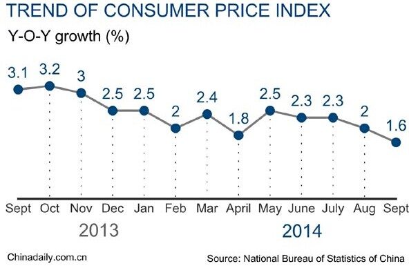 China's consumer prices rose by 1.6 percent from a year earlier, the lowest in a year, compared with a rise of 2 percent in August. The low reading creates room for policy adjustments as the economy weakens.