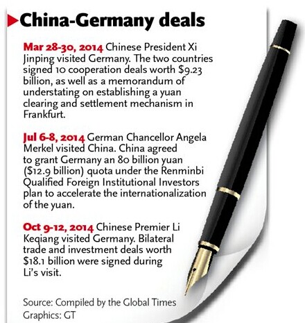 Germany is China's biggest partner in Europe in terms of trade, technological cooperation and investment, with their bilateral trade exceeding $160 billion in 2013, according to the Chinese central government's website.