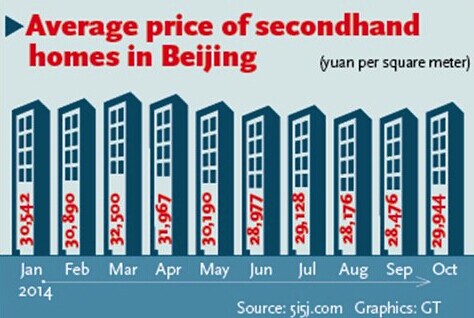 Data released Thursday by another property agency, 5i5j.com, also showed an increase in the average price of secondhand homes in Beijing to 29,944 yuan per square meter in October from 28,476 yuan in September.