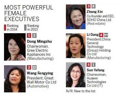 The female business leaders have also proved more willing or able in many cases to embrace changing industrial trends, said Liu, none more so than the woman at the top of this year's list, Gree Electric Appliances Inc Chairwoman and President Dong Mingzhu.