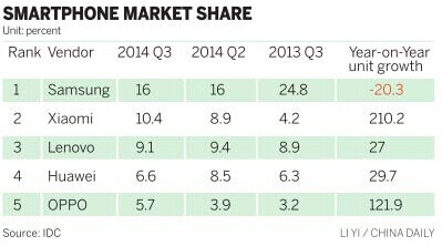 Xiaomi, the biggest local vendor by shipments, depends heavily on online sales. During this year's Nov 11 Singles' Day online shopping promotion, the Beijing-based company sold a record 1.16 million smartphones. Company executives described online sales as the most trusted and efficient revenue booster after the event.