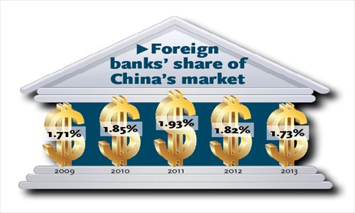Foreign banks controlled just 1.73 percent of total banking assets in China by the end of 2013, down from a peak of 2.38 percent in 2007. Their aggregated after-tax profit was 14 billion yuan ($2.26 billion) in 2013, while the country's banking industry realized a net profit of 1.38 trillion yuan in the same year, according to data from the China Banking Regulatory Commission.