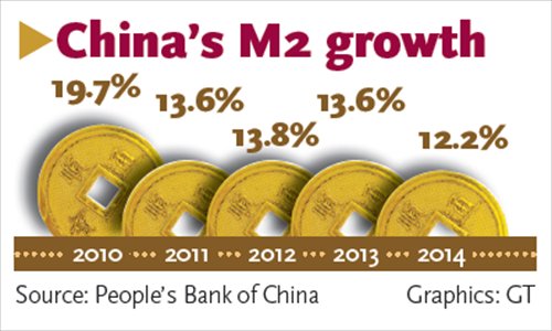 M2, a broad measure of money supply that covers cash in circulation and all deposits, grew by 12.2 percent year-on-year to 122.84 trillion yuan by the end of December, missing the central government's target of 13 percent for 2014.