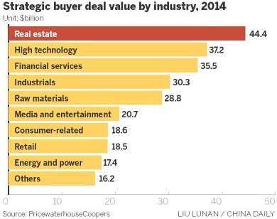 Gabriel Wong, lead partner of China corporate finance at PwC, said the number of Chinese outbound deals surged by more than one-third to reach $56.9 billion in 2014. North America overtook Europe last year in attracting Chinese investment with 96 completed deals, mainly focusing on technology, healthcare and real estate in the East Coast of the United States.