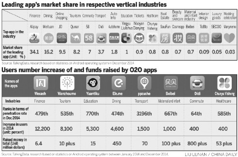 Statistics from Beijing-based Internet consultancy Analysys International says that the O2O market was worth 240 billion yuan ($38.54 billion) in 2014, compared with 200 billion yuan in 2013.