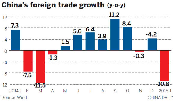 China's foreign trade stumbled by 10.8 percent to 2.09 trillion yuan ($341 billion) on a year-on-year basis in January, pushing the country to accelerate the pace of restructuring.