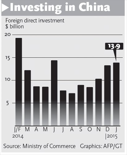 More free trade zones, which are set to allow yuan convertibility and fewer restrictions on FDI in China, may have helped with the FDI increase, Lu Zhengwei, a Shanghai-based chief economist at Industrial Bank Co, told the Global Times on Monday, citing the fact that last year, the free trade zones were extended to Guangdong and Fujian provinces and Tianjin after the approval of Shanghai in 2013.