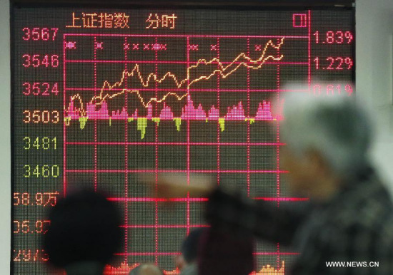 Investors look through stock information at a trading hall of a securities firm in Shanghai, east China, March 18, 2015. (Photo: Xinhua/Ding Ting)