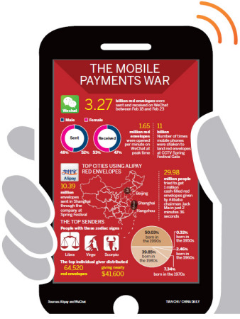 By investing billions of yuan to encourage people to send red envelopes online, Internet firms such as Alipay, WeChat and Weibo Corp have enabled users to link their debit cards with online payment accounts — viewed widely as being the most difficult factor in luring mobile payment users.