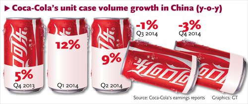 Coca-Cola reported a 2 percent global revenue decline year-on-year and 3 percent drop year-on-year in unit case volume growth in China in the fourth quarter of 2014, according to the company's most recent earnings report released on February 10.