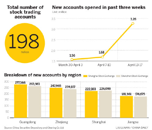 But that move, and repeated warnings about market risks, have been widely ignored. Investors opened a record 3.26 million new trading accounts last week, nearly double the number of the previous week, after the regulator removed the "one investor, one account" restriction, according to China Securities Depository and Clearing Corp Ltd, a State-owned clearing service company.