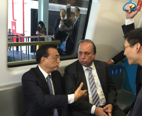 Premier Li Keqiang takes a ride on the new subway Line 4 with Rio de Janeiro Governor Luiz Fernando de Souza on Wednesday. The train was made by China's CNR Corp. (Provided to China Daily)