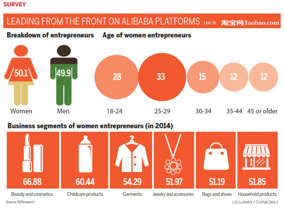 As of last year, women were running more than half of the shops on Taobao and Tmall, the two largest online platforms in China, and women-owned shops accounted for more than 46 percent of online transactions in 2014, according to a report by AliResearch, an affiliate of Alibaba Group Holding Ltd.